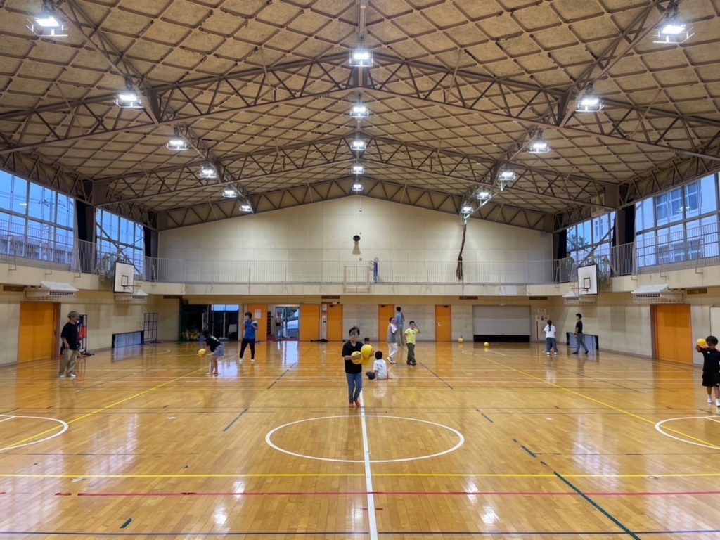 体育館で遊ぶ親子たち~普段は親子では遊べない場所なので楽しんでますね。